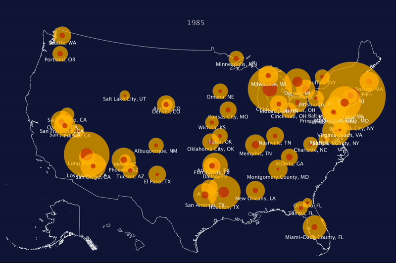This dynamic data visualization showcases the distribution and change in reported rape cases across the United States between 1985 and 2015. By utilizing storytelling techniques, it compares crime rate trends with population changes over time, offering a compelling narrative that highlights how these variables evolve and interact across various cities and regions. This animated representation allows viewers to observe patterns and uncover insights that static charts or reports might not convey as effectively.