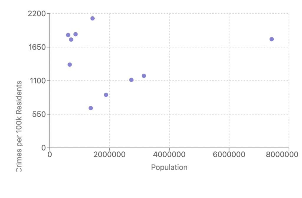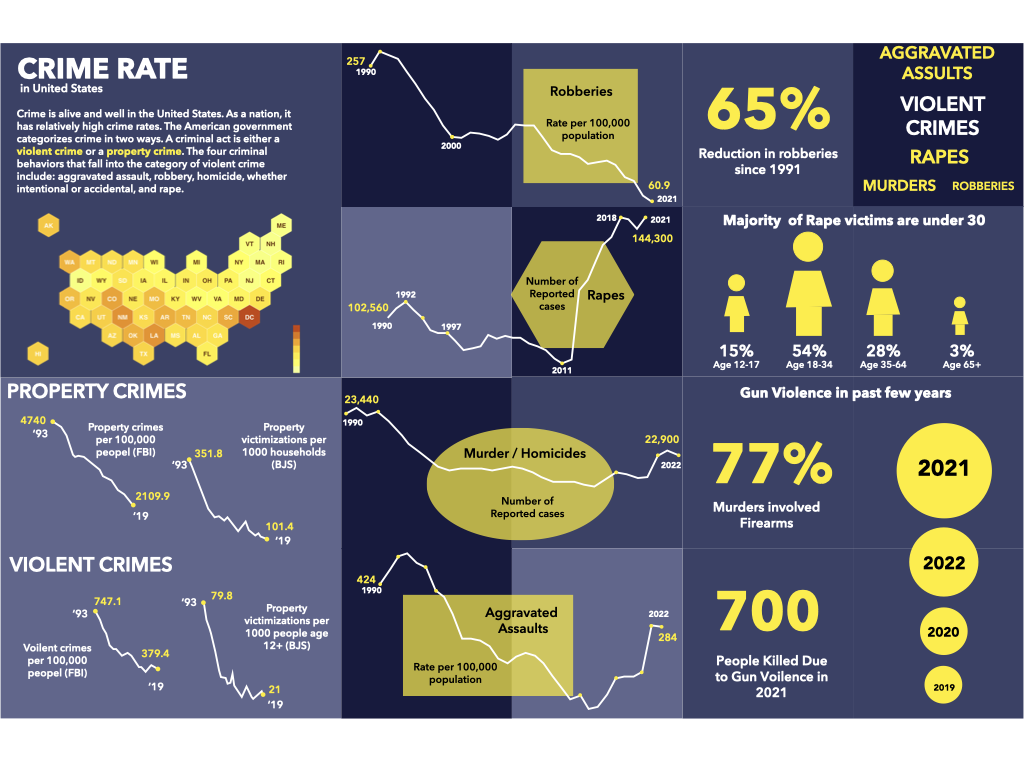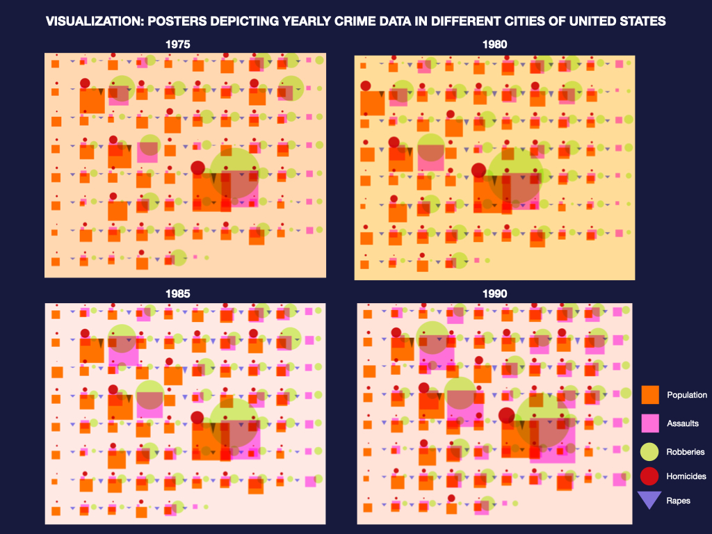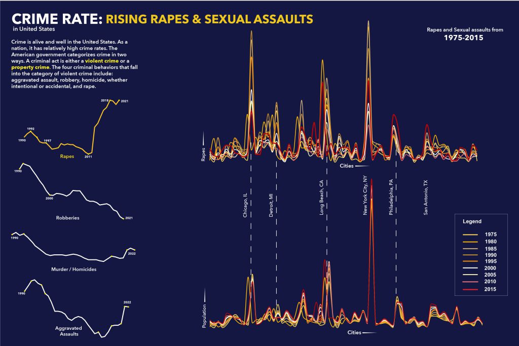 The dataset on crimes in various cities of the United States over the last 35 years has been analyzed and visualized using different layers, exploring multiple variations of representation. The main tools employed for the visualization process are Illustrator for creating static visualizations and JavaScript for interactive representations. By examining this dataset and its visualizations, we can gain valuable insights into the trends of crimes and their correlations with the population in these cities. The visualizations provide a comprehensive understanding of whether crimes are increasing or decreasing over time and how these trends relate to changes in population.