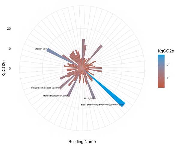 This graph represents building emission values for a campus, displaying the environmental impact of various campus buildings in terms of their KgCO2e rates.The radial plot provides a visual overview of these emissions, where each bar corresponds to a building, and the height of the bar represents the KgCO2e rate.The graph highlights the buildings with the highest emissions by labelling the top five buildings with the darkest colors, making them easily identifiable.