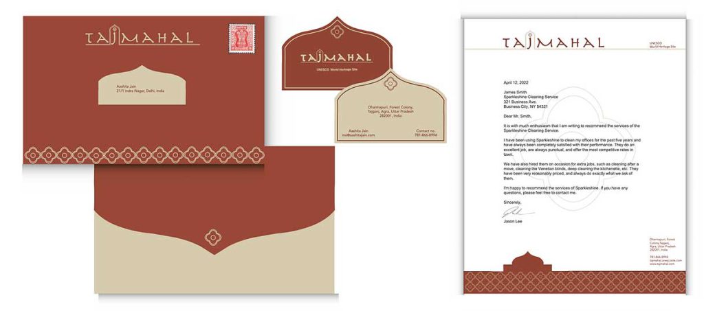 Envelope: The envelope maintains the minimalist theme, potentially featuring the Taj Mahal silhouette or the company logo in a smaller scale on the front. The recipient’s address would be placed in a clear, contrasting font for easy readability